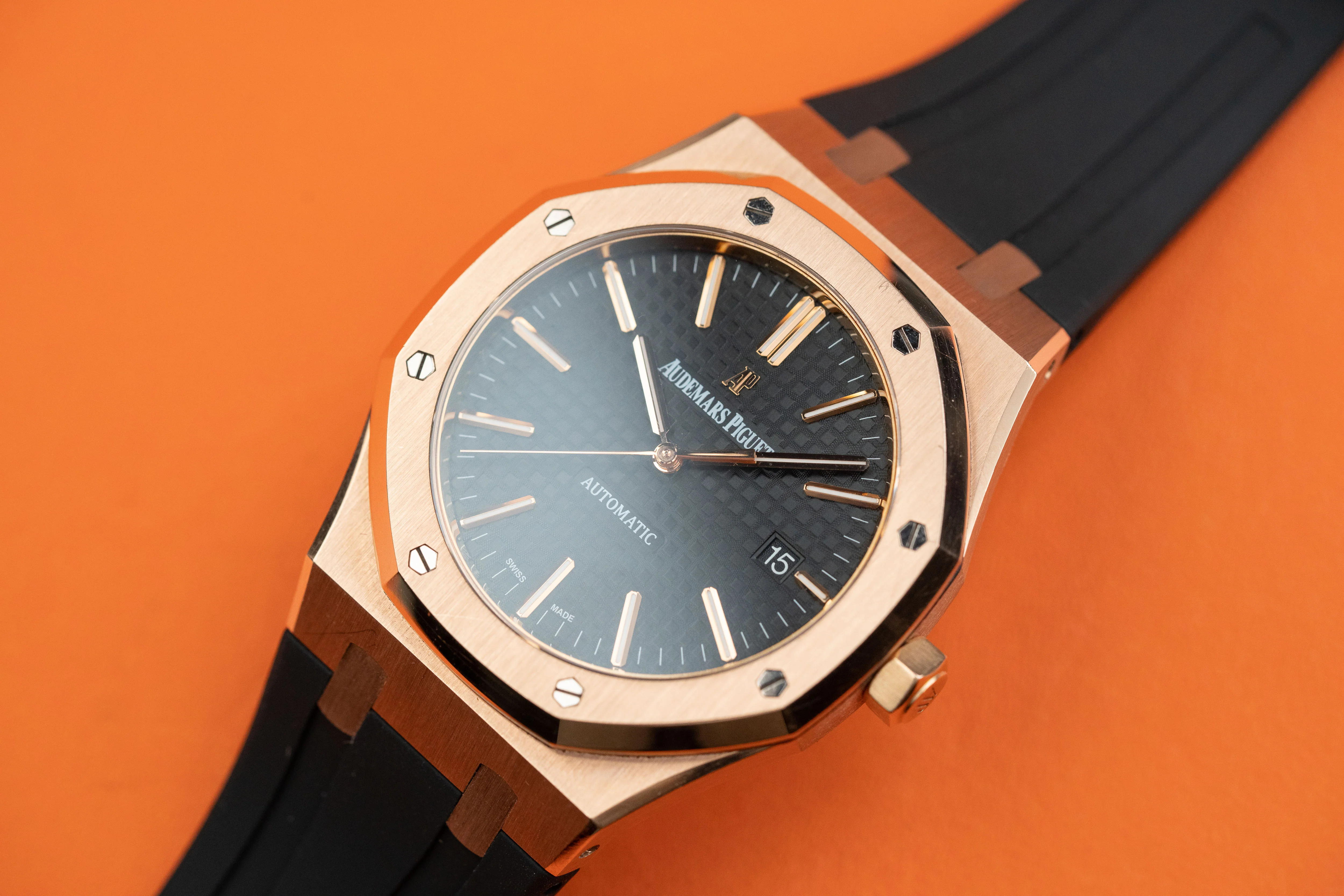 Audemars Piguet Royal Oak 15400OR.OO.D002CR.01 men's watch. 41mm 18k rose Gold case and 18K rose gold octagon shaped fixed bezel. Black tapisserie pattern dial with rose gold-tone luminous hands and luminous index hour markers. Date display at 3 o'clock position. Black rubber strap with 18k rose gold folding clasp. Will fit up to an 7.25-inch wrist. Sapphire crystal. Clear case back. Calibre 3120 automatic self-winding movement with a 60-hour power reserve. Original Box and Papers included.