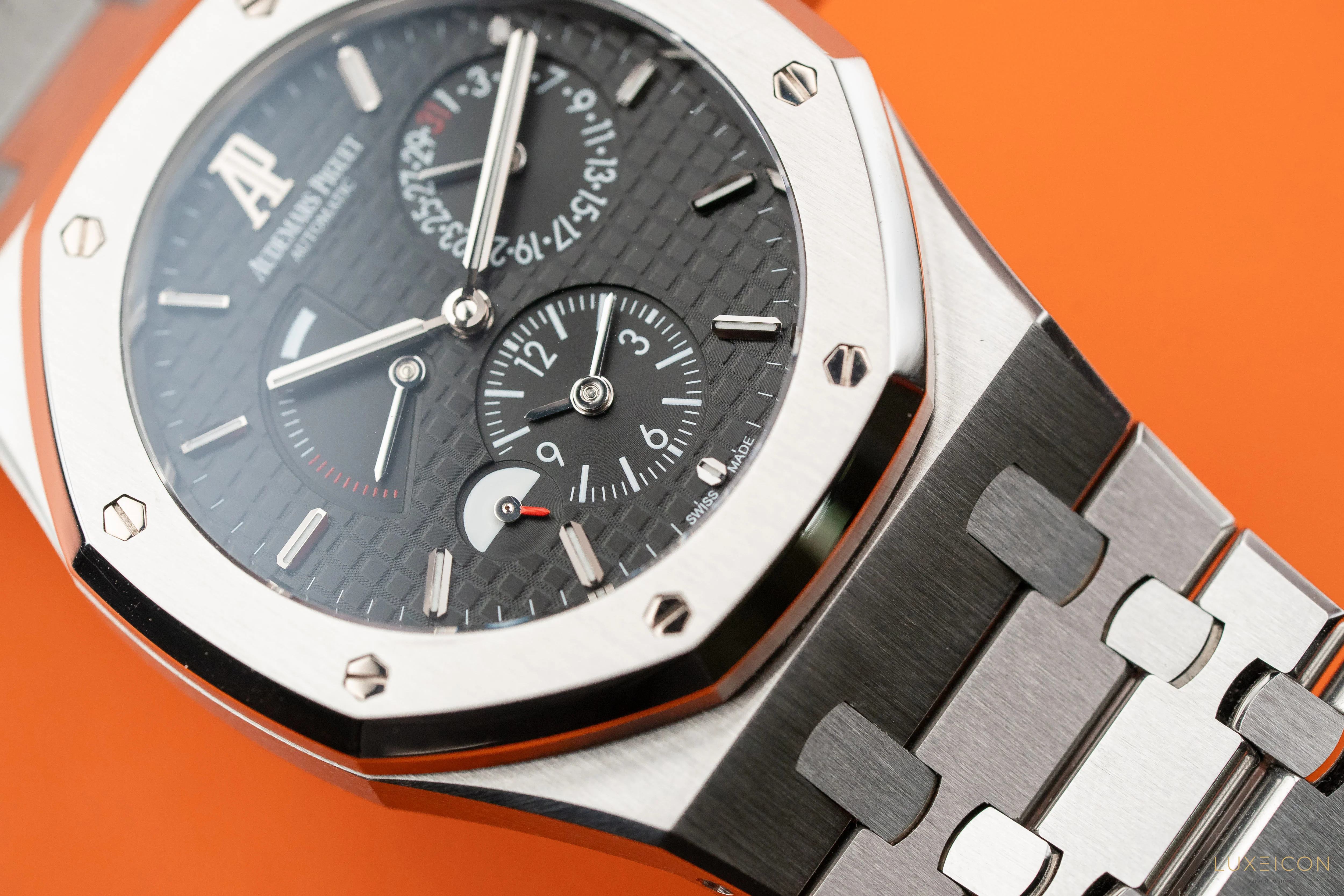 Audemars Piguet 26120ST Royal Oak Dual Time Automatic 39mm, Stainless Steel on Bracelet, Black "Clous de Paris" Grande Tapisserie Dial, White Gold Applied Hour-Markers and Royal Oak Hands with Luminescent Coating, Self-Winding AP Calibre Automatic Movement