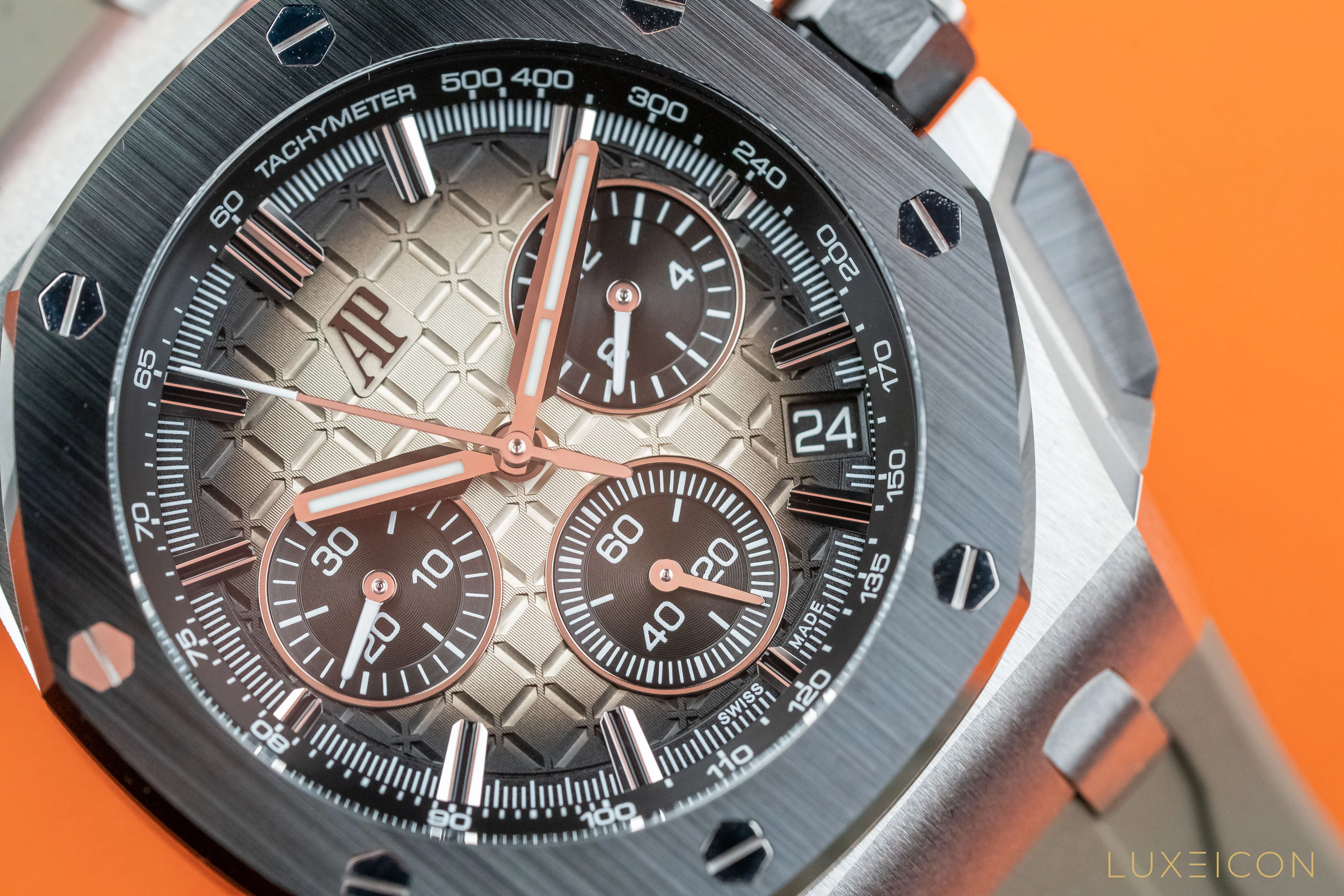 Case Stainless Steel Case, Glareproofed Sapphire Crystal And Caseback, Black Ceramic Bezel, Pushpieces And Screw-locked Crown, Sandblasted Stainless Steel Pushpiece Guards Size 43 Mm Thickness 14.4 Mm Water Resistance 100 M Dial Smoked Light Brown Dial With “méga Tapisserie” Pattern, Black Counters And External Zone, White Gold Applied Hour-markers, White Gold Royal Oak Hands With Luminescent Coating, Black Inner Bezel Bracelet Light Brown Rubber Strap With Stainless Steel Ap Pin Buckle And Interchangeable Strap System. Additional Black Rubber Strap