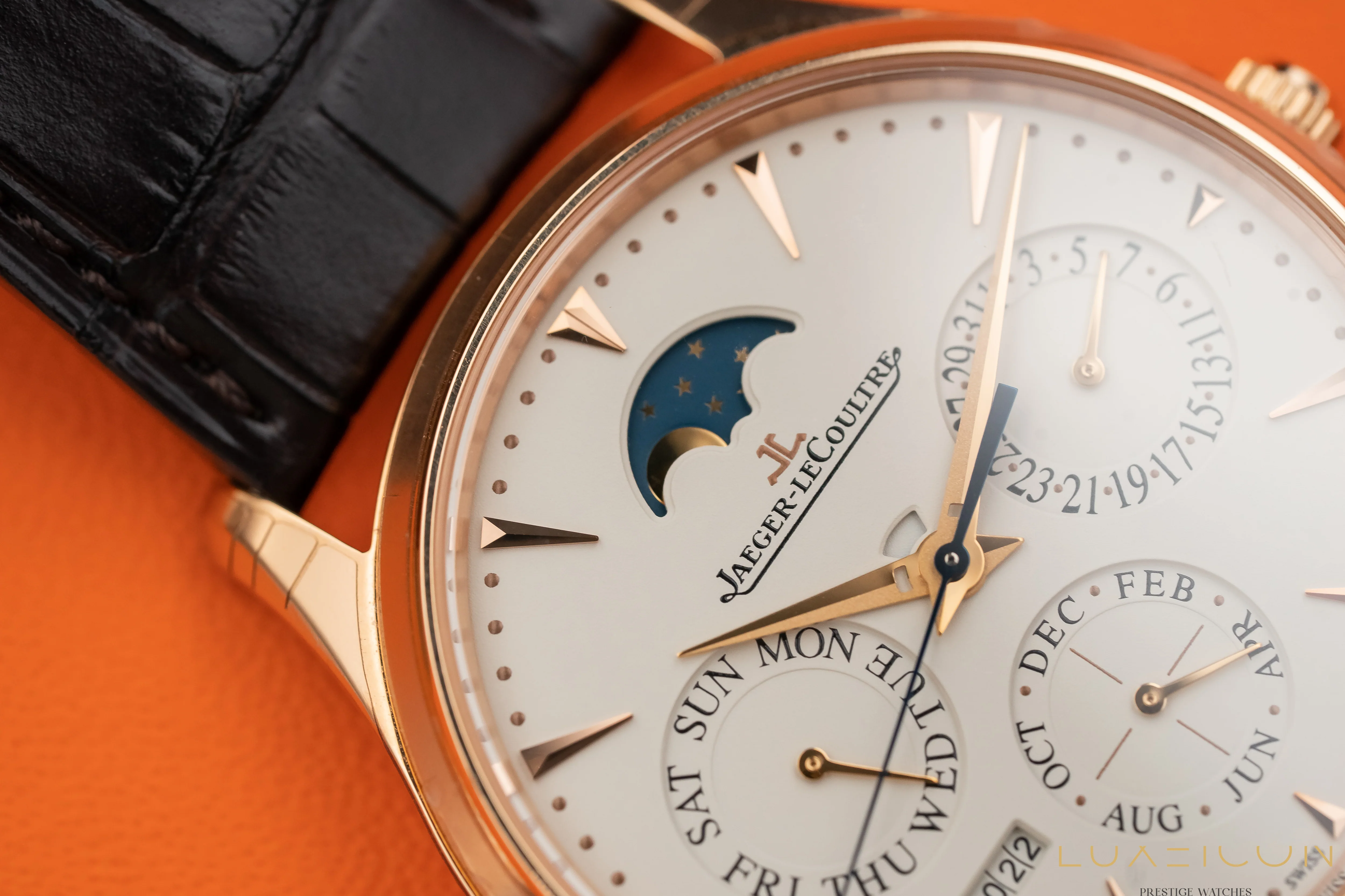 Jaeger-LeCoultre Calibre : 868/1Case : Pink Gold, Water-resistance : 5 bar, Diameter : 39mm, Thickness : 9.2mmFunctions : Year, Perpetual calendar, Date, Hour – Minute, Day, Month, Moon phases, SecondsRecto Hands DauphinesMovement : Automatic, self-winding, Components : 336, Vibrations per hour : 28800, Jewels : 46, Barrel : 1, Height : 4.72 mmDial : Eggshell beige, Gilt hour-markersStrap/bracelet Leather