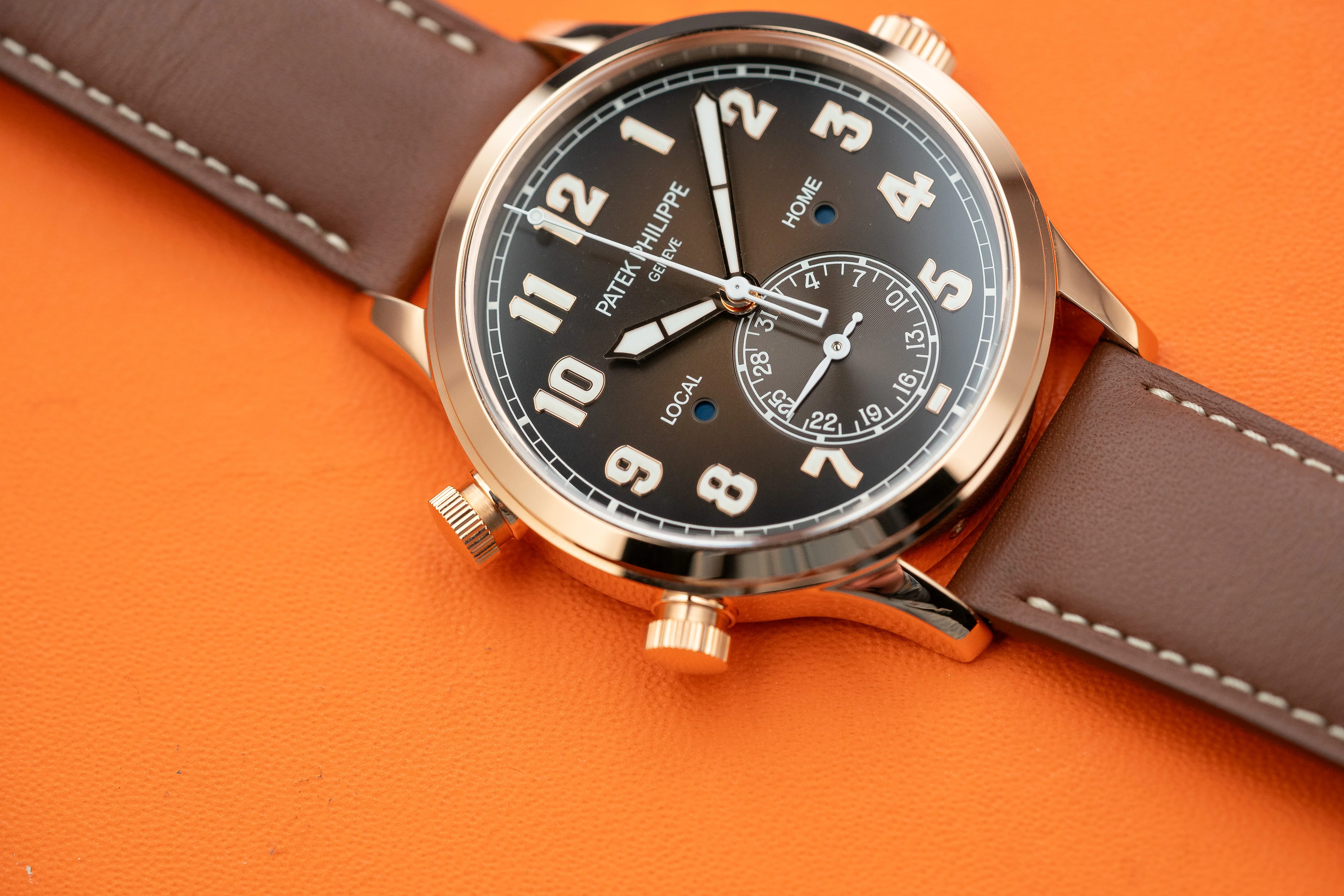 Patek Philippe 5524R Calatrava Pilot Travel Time 5524R-001, 5524R001, 18k rose gold case on a brown calfskin strap with an 18k rose gold tang buckle, automatic Patek Philippe caliber 324 S C FUS movement, brown varnished dial with large applied gold luminous Arabic numerals, luminous hands with central sweep seconds, pointer dated at 6 o'clock, home time displayed with a skeleton hand, AP/PM indicators for local and home time, display back, sapphire crystal, size 42mm, thickness 11mm.