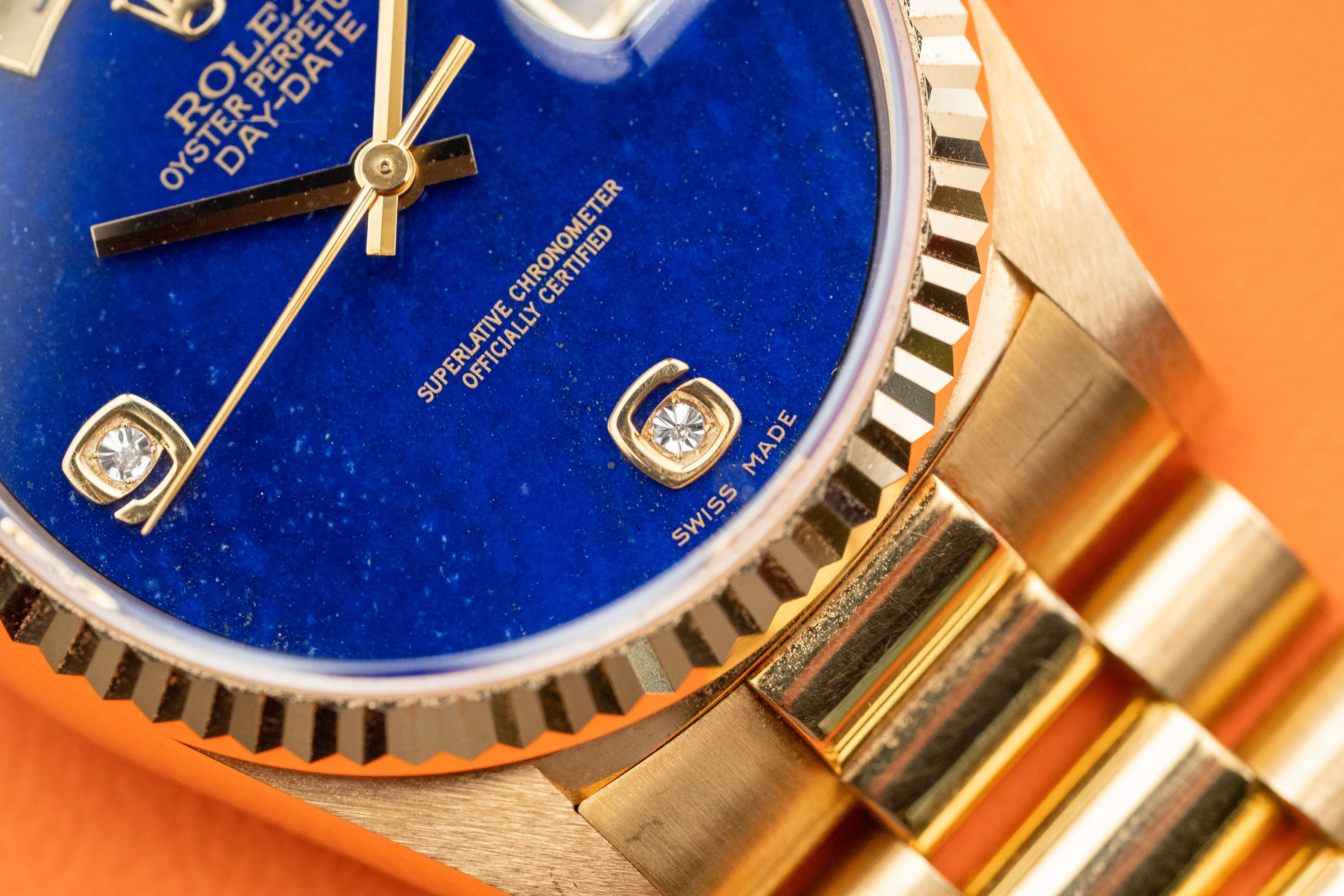 Rolex Oyster Perpetual Day-Date ‘Lapis Lazuli’ Reference 18238 from 1995 including full set. The Day-Date 18238 measures a 36mm 18k gold case, a 18k gold president bracelet with Crownclasp and fluted 18k gold bezel. The Day-Date 18238 features an automatic movement caliber 3155 with a double quickset date and day function, a scratch resistance sapphire crystal and a rare Lapis Lazuli dial with diamand markers.
