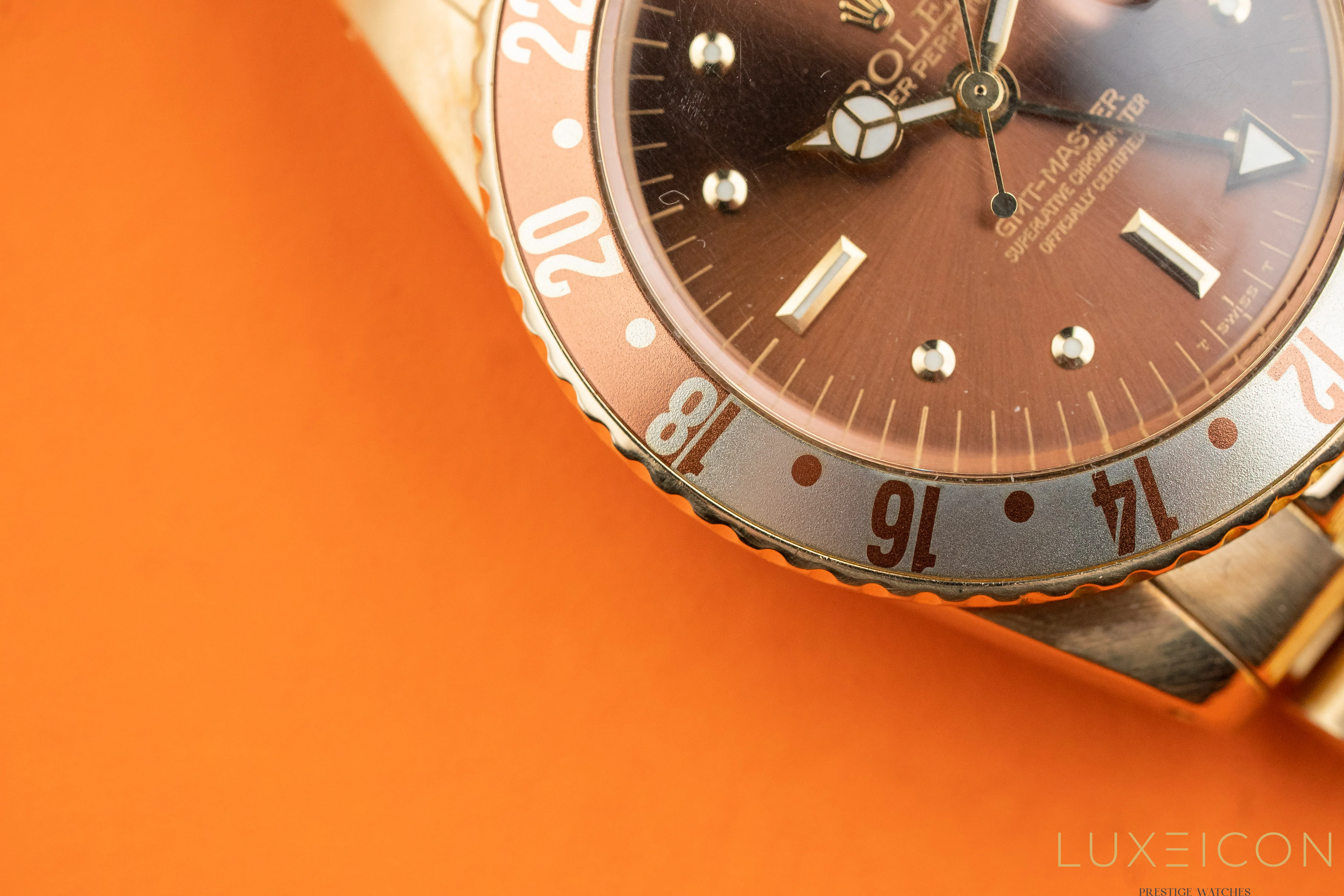 Rolex GMT-Master Vintage 1975 Root Beer Nipple Dial Fat Font Bezel Yellow Gold 1675/8