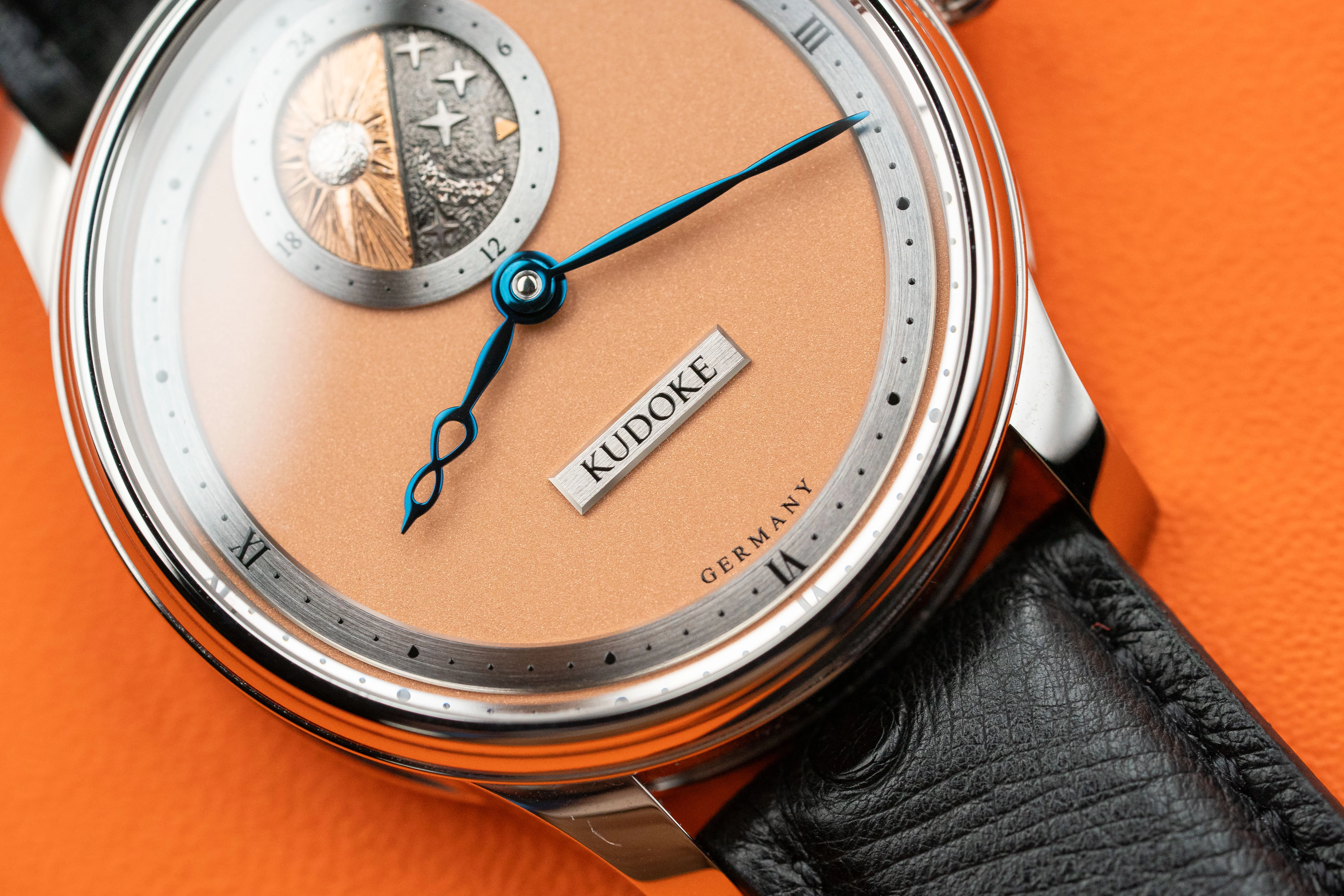 This piece delivers Kudoke’s signature design restraint combined with artistic nuance. The addition of the small day/night disk at 12 o’clock provides a 24 hour display to enhance the functionality without complicating the elegant dial.